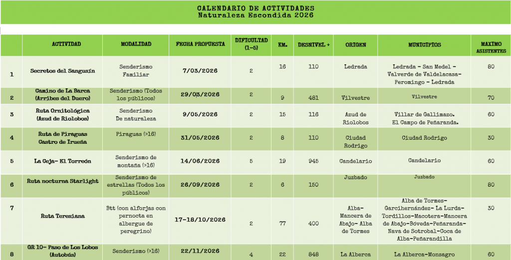 Naturaleza Escondida es un proyecto de la Diputación de Salamanca donde podrás encontrar rutas de naturaleza y descubrir esos rincones más recónditos y con encanto de la provincia salmantina. Esta será la octava edición de este proyecto de turismo de naturaleza, el cual ha acogido más de 3.000 personas en las pasadas ediciones.